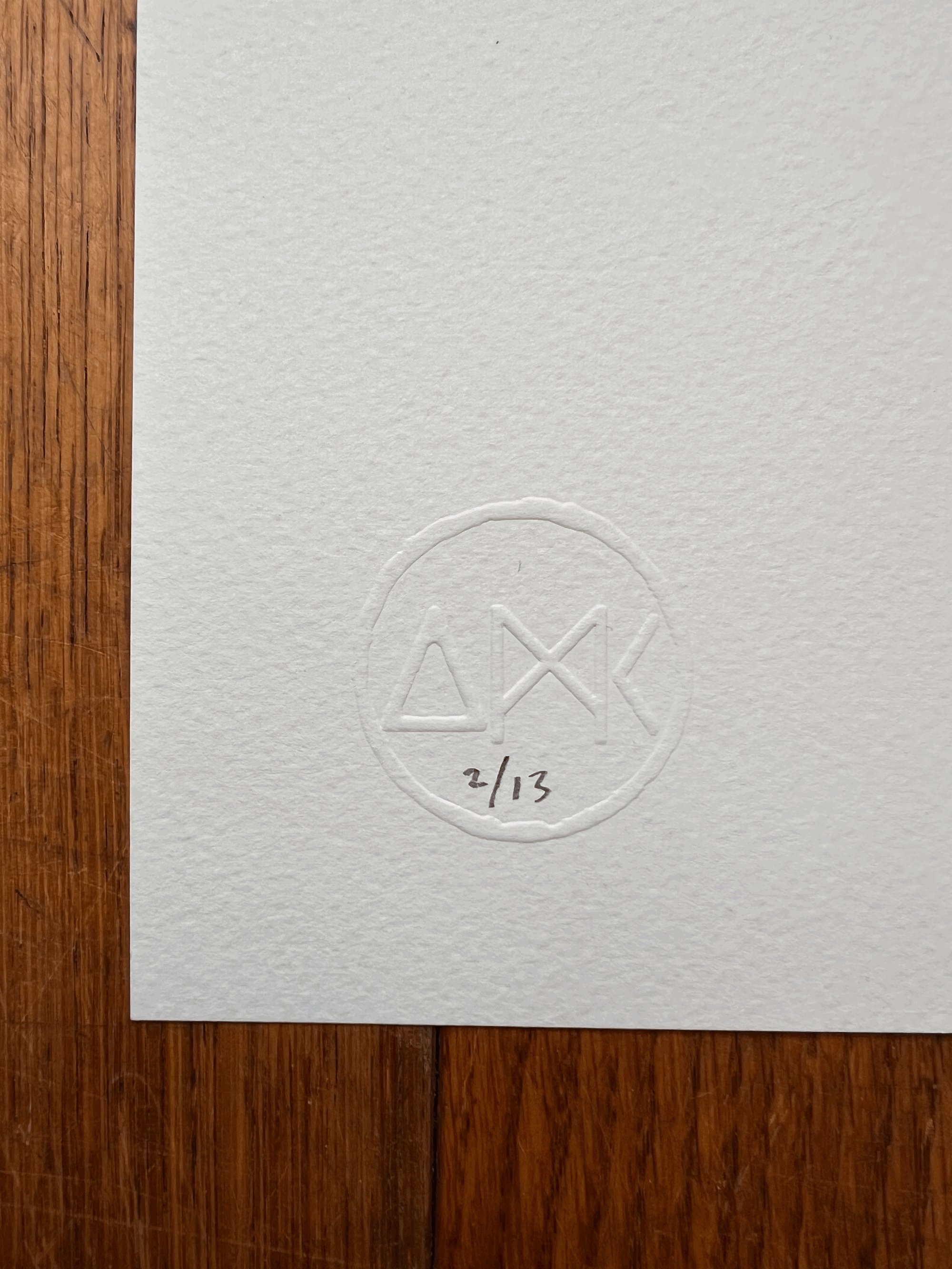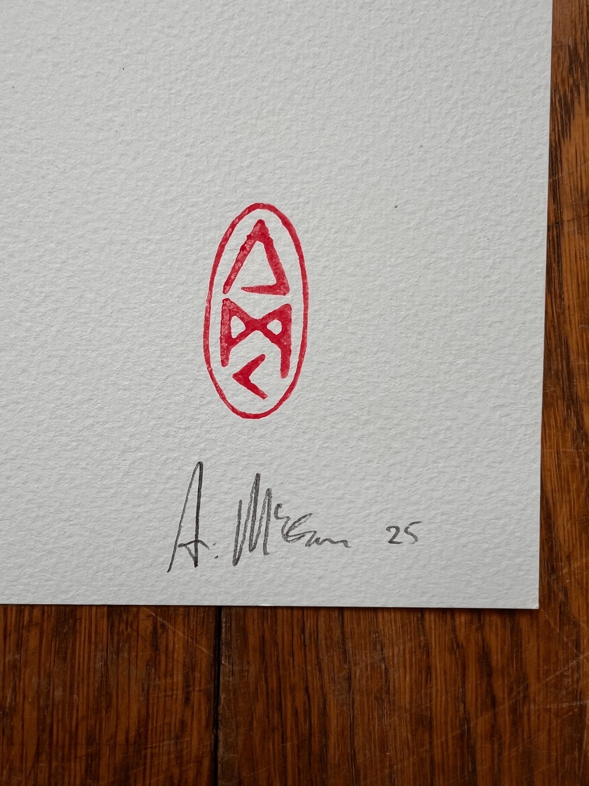 Buzz is beautifully hand printed with a 3 colour sprayed initial layer, overlaid with a hand printed Lino plate layer. Finished off with a hand painted 24 carat gold powder perch. Offff….