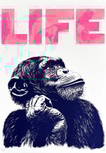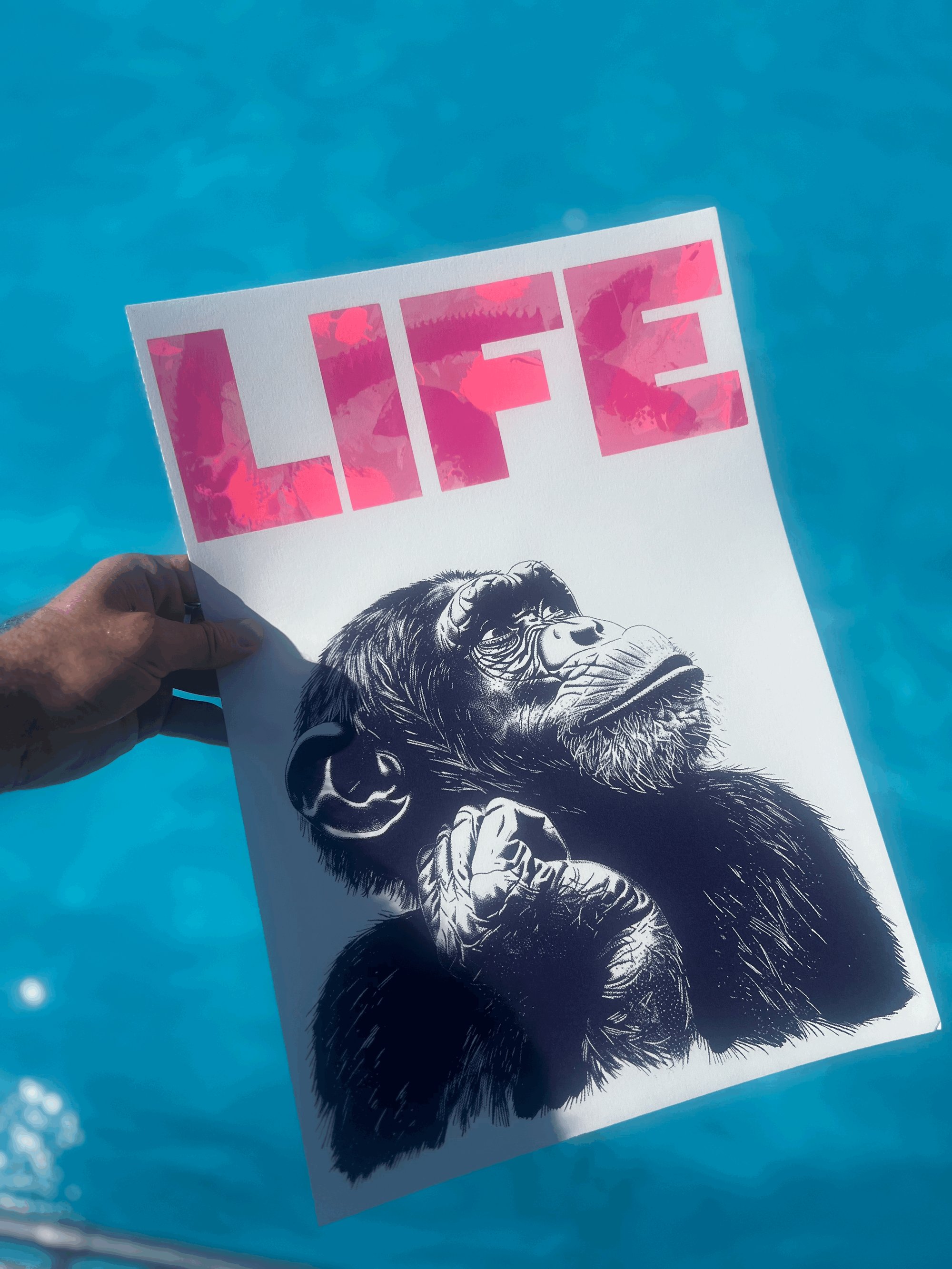 2 colour screen print complemented with a bright mono print on the word, to make each print unique.
