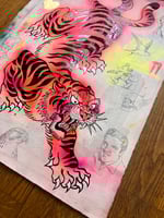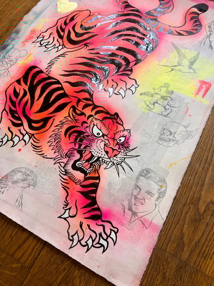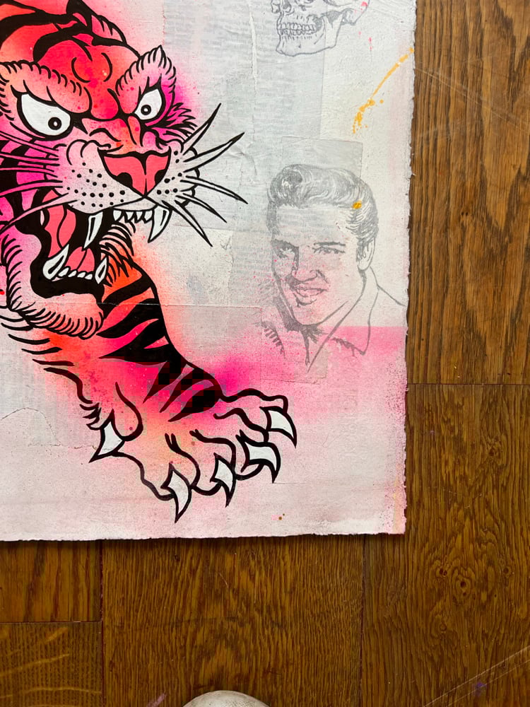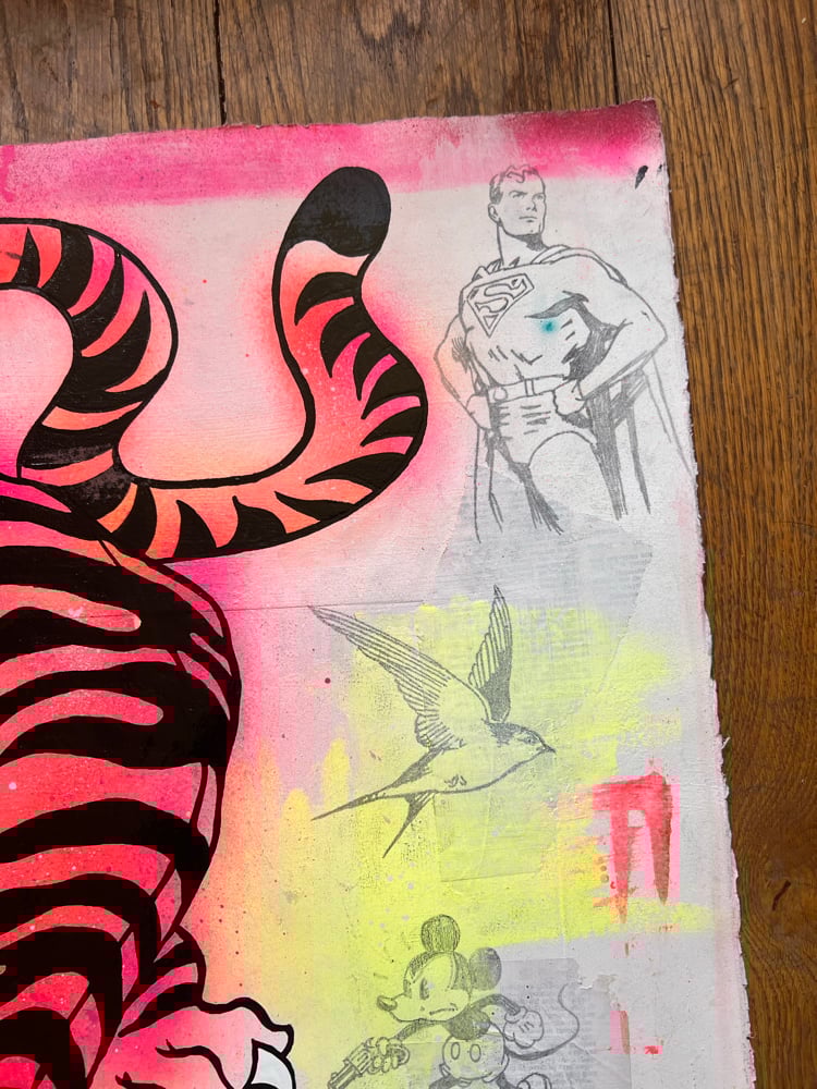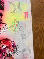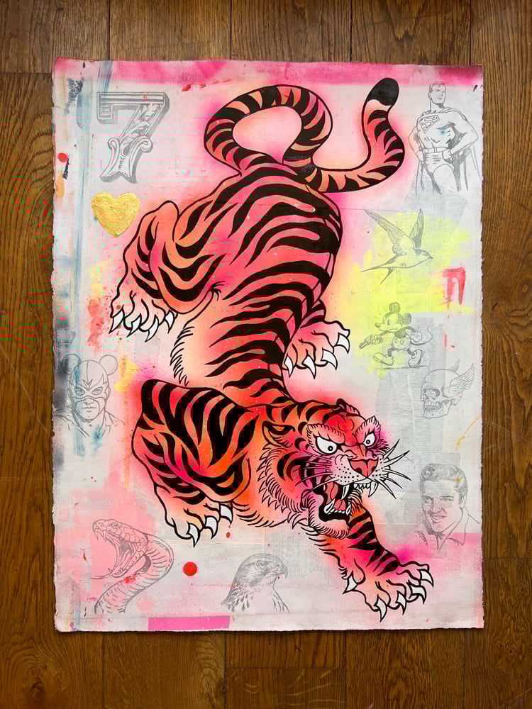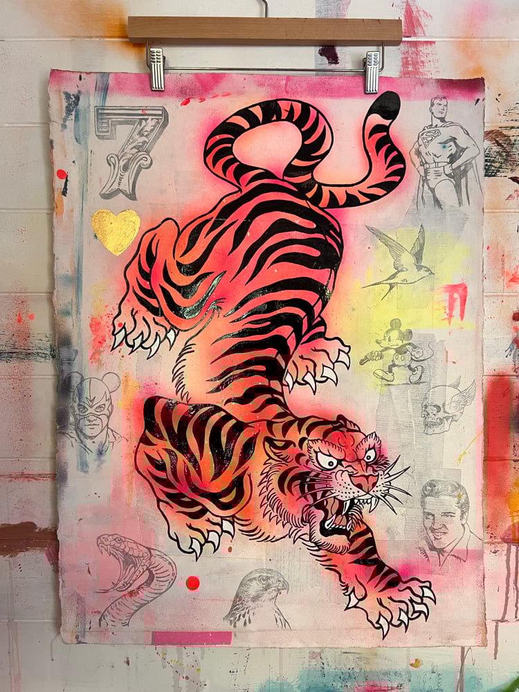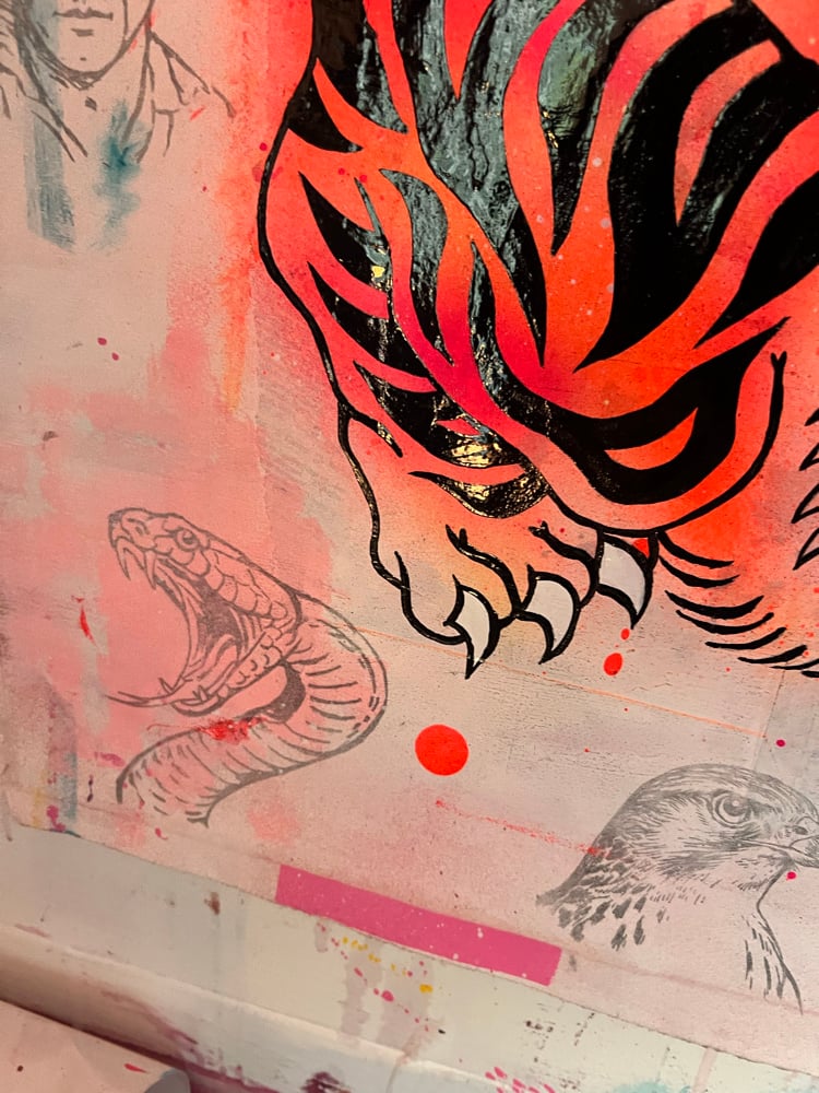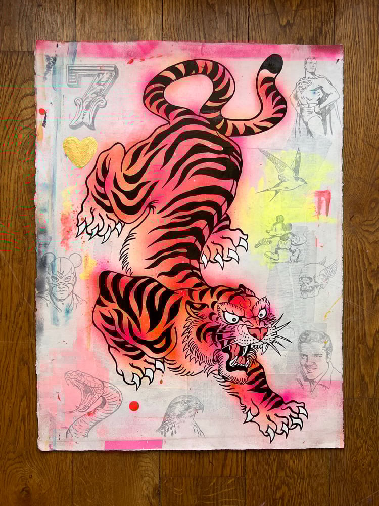 Acrylic, One Shot gloss, ink, pencil and gold leaf on 450gsm water-colour paper with vintage book pages.