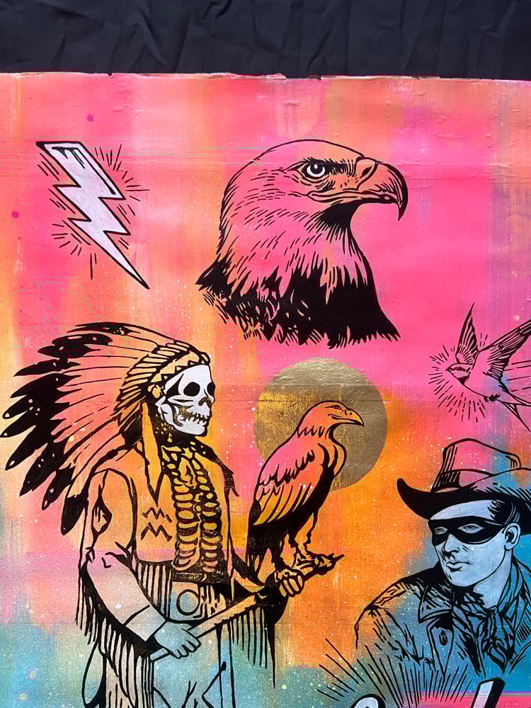 Acrylic, One Shot gloss, ink and copper leaf on 450gsm water-colour paper with vintage book pages.