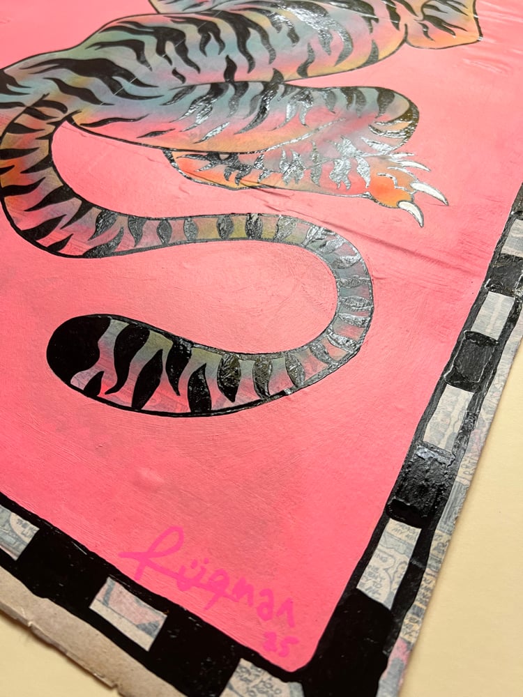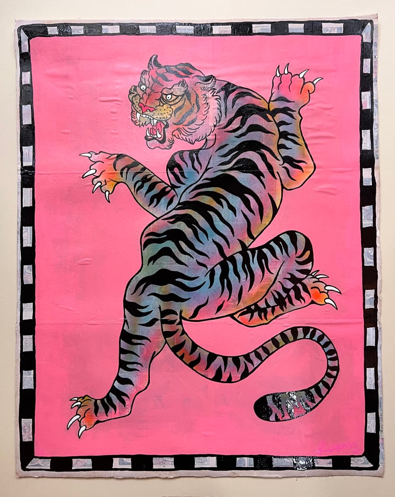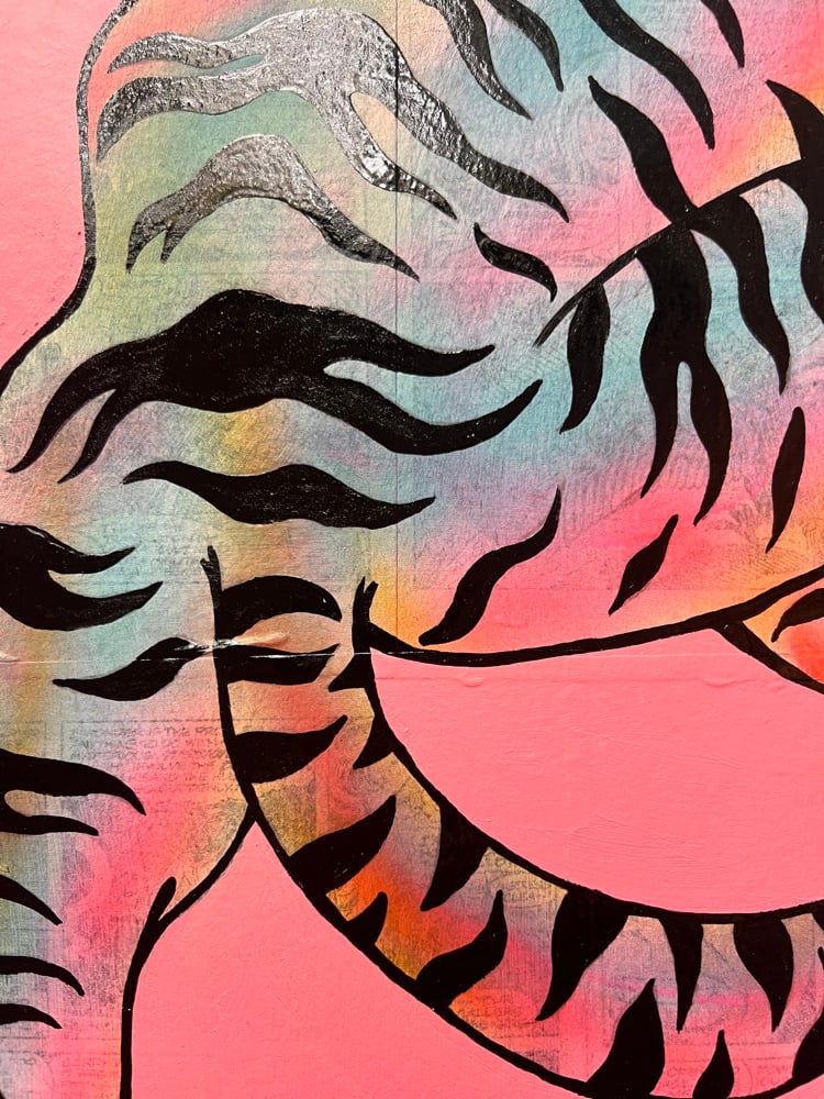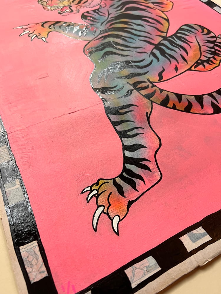 Acrylic, One Shot gloss and ink on 450gsm water-colour paper with vintage comic pages.