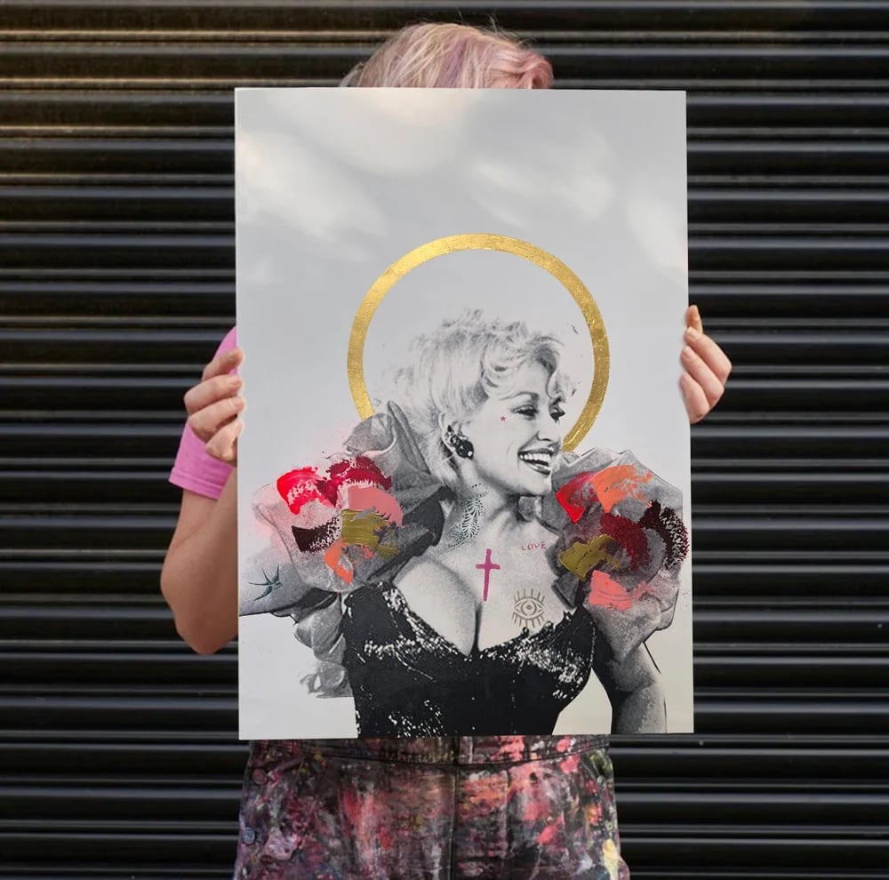 Screen print complemented with hand finished multicoloured paint and stencils which makes each print unique.